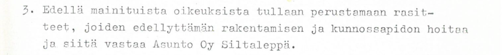 • että rasitteiden edellyttämän rakentamisen ja kunnossapidon hoitaa ja siitä vastaa Asunto Oy Siltaleppä